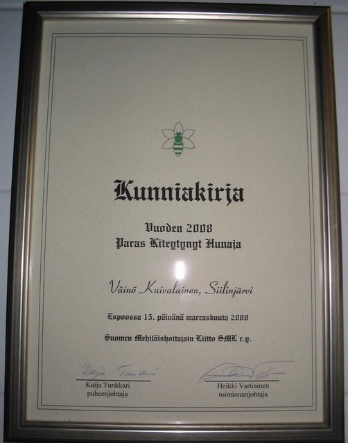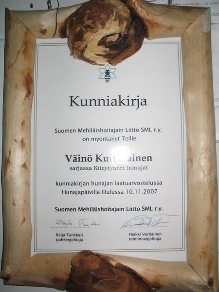 Panostuksemme osaamiseen sekä tuotteiden korkeaan laatuun on huomiotu Suomen Mehiläishoitajain liiton palkinnoin sekä kunniakirjoin.